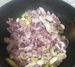 大火燒熱鍋中的油,放入剛剛輕煮過的鴨塊和蔥薑蒜,翻炒2分鐘後蓋上鍋蓋,燜燒5分鐘,咱們主要是為瞭讓鍋中的溫度,從而逼出鴨肉中的水分,這樣做好的鴨子不會有濃重的腥味,且鴨肉特別的有香味,之後掀開蓋子,翻炒至鍋中鴨塊,煤氣調成中小火,到入適量老抽、冰糖和鹽翻炒均勻,再轉大火炒3分鐘,讓味道完全進入鴨肉中,之後倒入啤酒,蓋上蓋子大火燜燒10分鐘,等待收汁差不多的時候就可以瞭