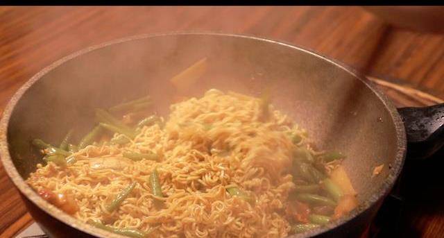 要讓面能夠充分吸收湯汁。5分鐘時間到就可以出鍋享用瞭。打開鍋蓋時香氣撲鼻,面的口感很勁道,有肉香,有菜香。