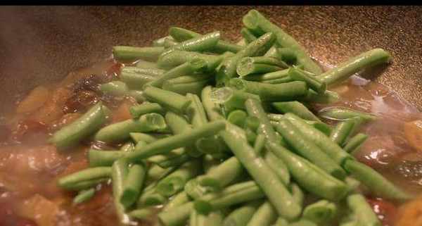 30分鐘後將切好的豆角下鍋,拌勻後蓋蓋子繼續小火燜煮10分鐘