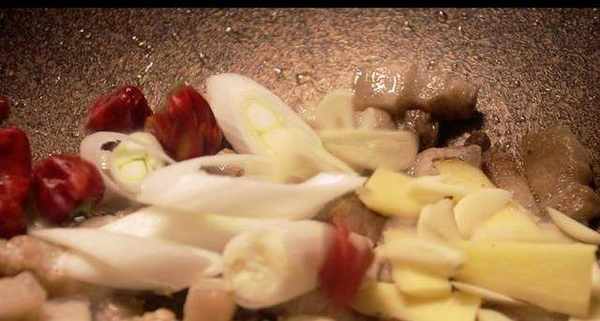 熱鍋倒入少許食用油,油熱將瀝幹水分的五花肉下鍋,快速翻炒出油脂,表面顏色微黃時倒入蒜片,剩餘的蔥薑片,以及幹辣椒和香料