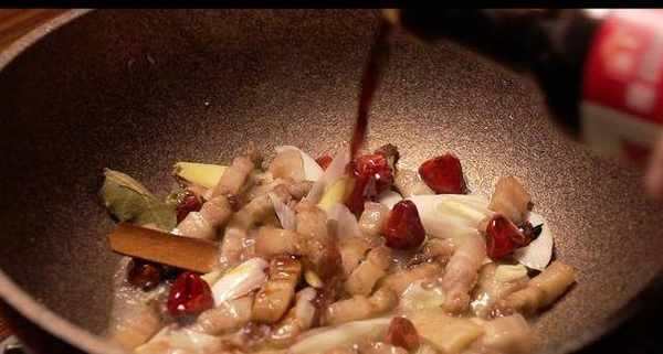 然後往鍋中加入一勺料酒,一勺生抽,半勺老抽,繼續翻炒至五花肉上色