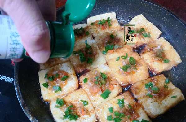 6、等到鍋裡的豆腐被完全煎熟後,再把切好的蔥段撒到豆腐上,然後撒上適量的燒烤粉調味料提香。隨後,就可以準備關火出鍋啦。