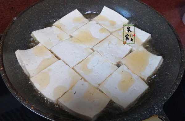 3、食材都準備好後就可以開始起鍋熱油瞭,取出傢中的平底鍋,然後往鍋裡倒入適量的食用油。開火將油溫加熱到五成左右的時候,就用筷子將豆腐夾到鍋裡煎。