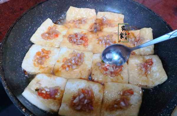 5、碗裡的食材攪拌均勻後用勺子勺到豆腐上,這個時候我們就不要再翻動鍋裡的豆腐瞭,以防止食材散落到鍋裡。