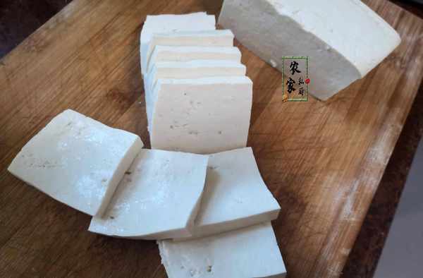 1、準備好適量的豆腐,先將豆腐用清水沖洗一遍,洗凈之後再用刀切成適量薄厚的豆腐片。