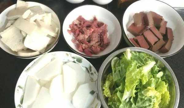 1、小菜準備:蘿卜的一半去皮切成片,老豆腐一片切成厚片,鴨血洗凈切成片,樁白菜洗凈後使用,牛肉選擇軟肩膀的牛排肉切成薄片,當然可以把海帶、土豆、豆芽、粉等組合起來做菜。