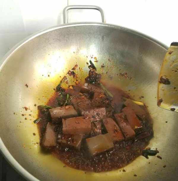 7、鴨子血腥,先用鴨血炒,放入料酒炒味。