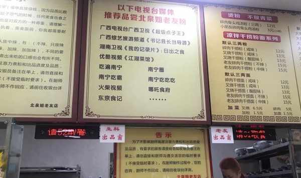 以前的店面老舊破,如今是新店,所以環境這些比較乾淨,北泉姐一頭紅發風風火火的十分熱情,還曾經上過電視,她不接受催單和急單,堅持慢工出細活,絕不降低每一碗粉的品質,對老友粉有自己的要求,你可以在點單的時候提一些特殊的要求,但是絕不能臨時要求她,因為她對每一碗粉都很有堅持,這麼多年一直堅持親自炒料、熬湯,不過煮粉的有時候是她,有時候就是她的老公。
