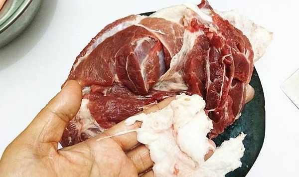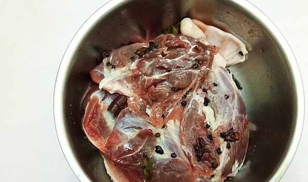 步驟4、這是醃漬瞭24小時的肘子,鹽粒基本都沁到肉中。