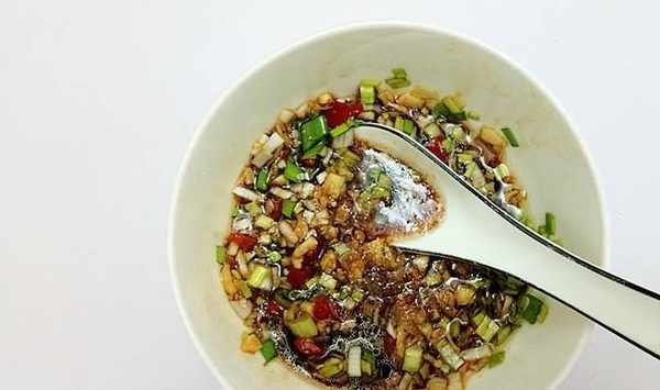 步驟11、切好的小料放入碗中,依次加入生抽、香醋、香油等調料。蘸料可以根據自己的喜好酌情添加。
