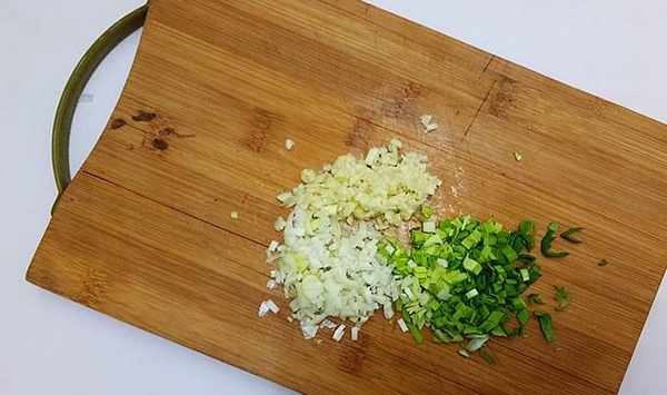 步驟10、吃的時候我們做個蘸料:薑切末,大蒜切末、再切一點蒜苗。喜歡吃辣的可以放兩個小米辣。