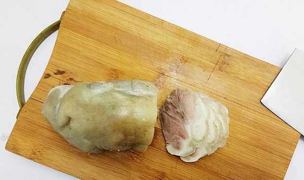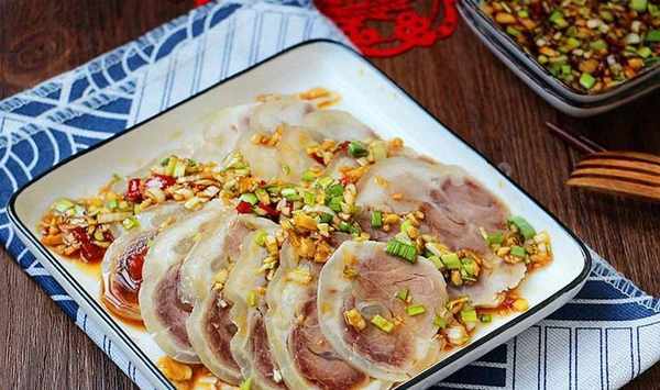 步驟12、完全涼透的豬肘取出,打開保鮮膜,切成均勻的薄片,帶著蘸料一起上桌即好。