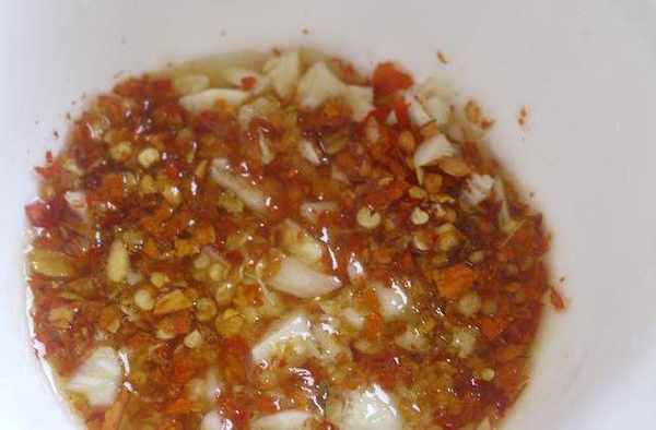 準備一個碗,入蒜泥、雞精、鹽、辣椒粉,起鍋熱油後澆入碗中;