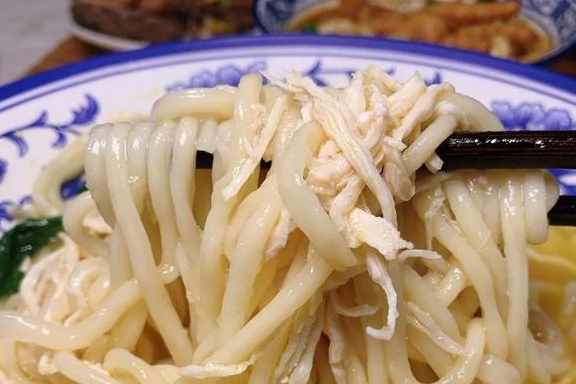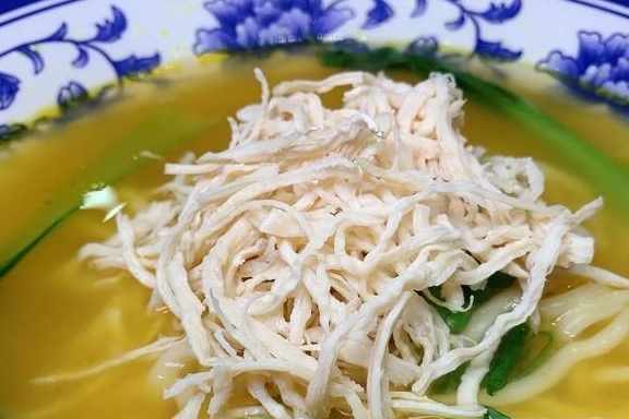 一口入魂的金湯雞絲面同樣驚豔,有種在吃酸菜魚的感覺。金黃色的湯底酸爽過癮,麵條口感筋道,嗦一口實在是滿足。