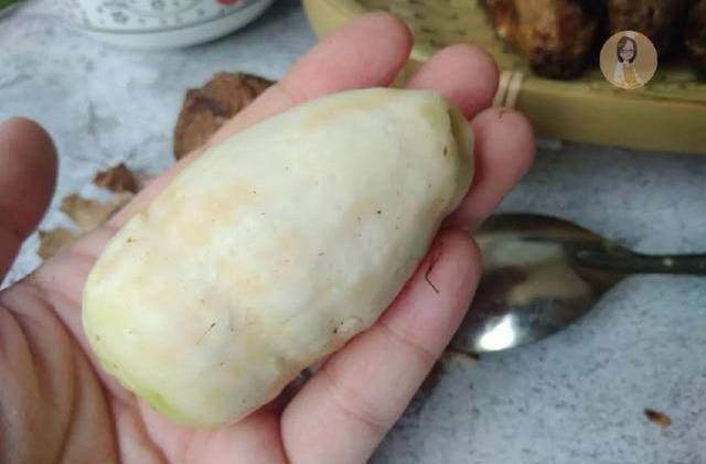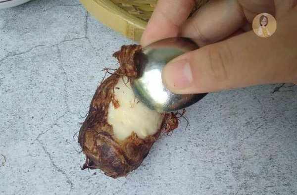 取一把不銹鋼勺子,如圖所示可以很容易去除芋艿的表皮。