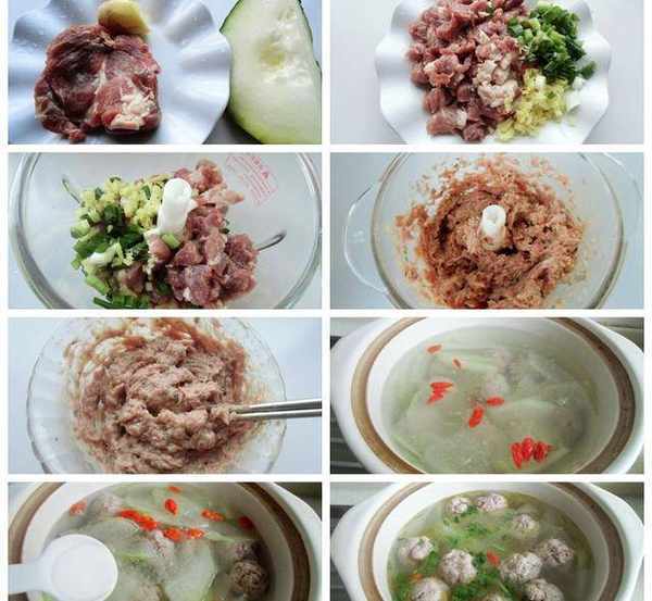 做法:1、把香蔥洗凈切末,香菜洗凈切末、薑切小丁,枸杞用冷水泡泡2、把豬肉切小塊,加絞肉機裡,加薑、香蔥打成肉泥,取出肉泥,加水、料酒不停朝一個方向用筷子攪拌,一定要攪拌上勁3、加生抽、蠔油、五香粉、雞精攪拌均勻,再加淀粉攪拌均勻,加香油拌均勻,靜止一會入味4、把冬瓜去皮,切片5、煮鍋裡加水,大火燒開,下冬瓜,加蓋大火燒開,6、把豬肉泥用勺子挖成小丸子形狀,下冬瓜鍋裡,煮到丸子飄起下、加鹽,枸杞煮雞精1分鐘7、關火滴幾滴香油,加胡椒粉、撒上香菜末即可