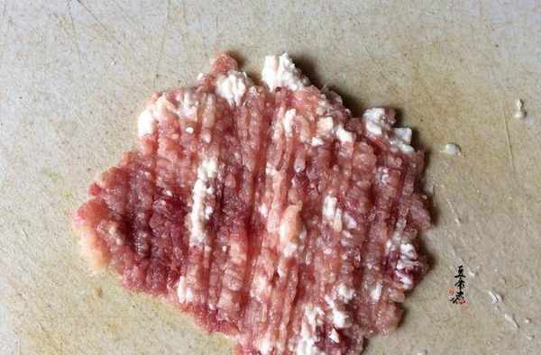 做法:肉末的選擇上使用五花肉,把皮去掉切成細條再改丁並剁碎