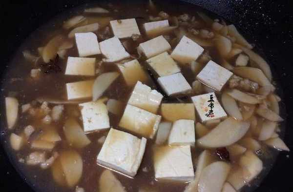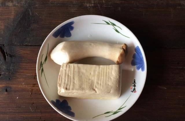 把鹵水及杏鮑菇稍煮一會就能放入豆腐瞭,煮的時候要註意。全程不蓋鍋蓋,鍋蓋一蓋豆腐馬上就膨脹就有孔。影響食用口感!待收汁差不多用水淀粉勾兌下即可出鍋