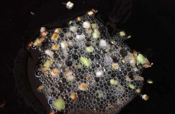 鍋熱油倒入蔥白碎,小火爆香爆至微焦黃即可