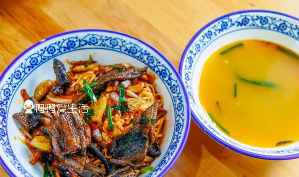 爆鱔番茄汁拌川,拌川是他們家的特色,點單後現做。熱鍋翻炒,香氣四溢!各種澆頭原料就放在灶台上,你可以看到整個烹製過程!番茄汁口味濃郁,上面的黃鱔片爆炒過後口感焦脆。拌川有搭配一碗蕃茄清湯,分量大!