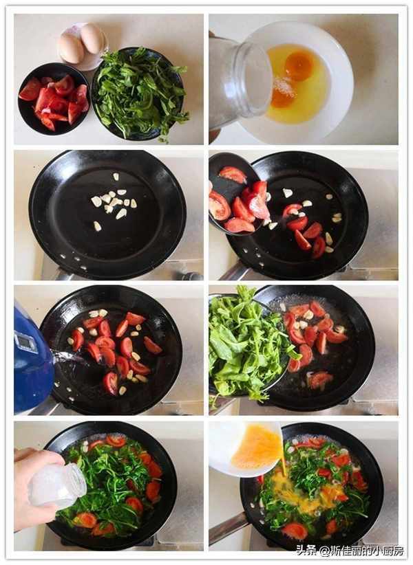 原料: 雞蛋 2個 枸杞葉 1盤 番茄 1盤 蒜 少許 油鹽 適量