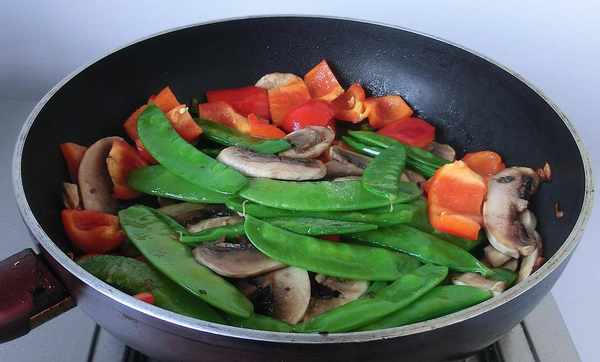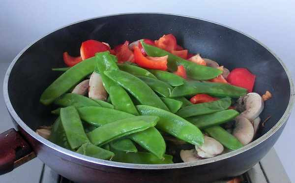 做法:1. 荷蘭豆沖洗撕去兩邊的老筋,紅椒、口蘑洗凈切片