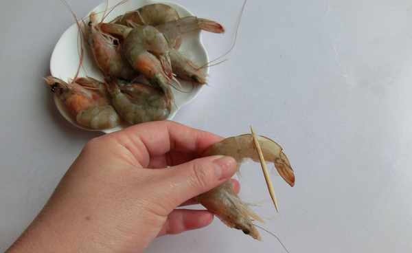 做法:1.蝦洗凈,用牙簽紮進蝦的尾部第二節挑出蝦線