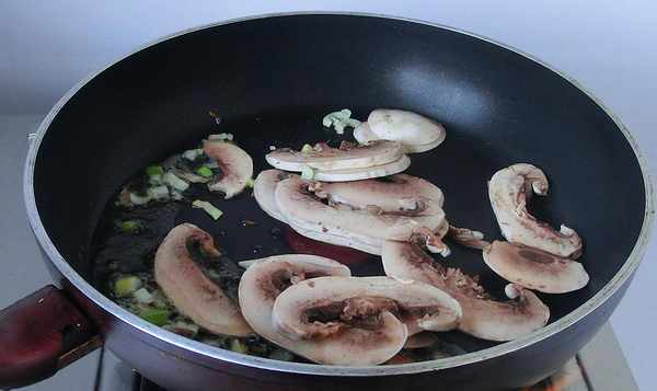 2. 鍋中熱油,放入蔥、薑末炒香,下口蘑片翻炒