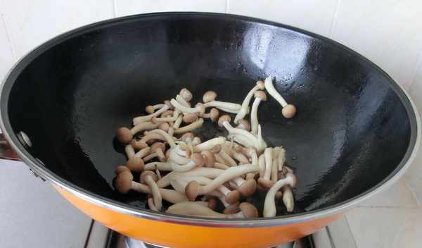3.鍋中放入少許油,放入蟹味菇、娃娃菜炒軟。