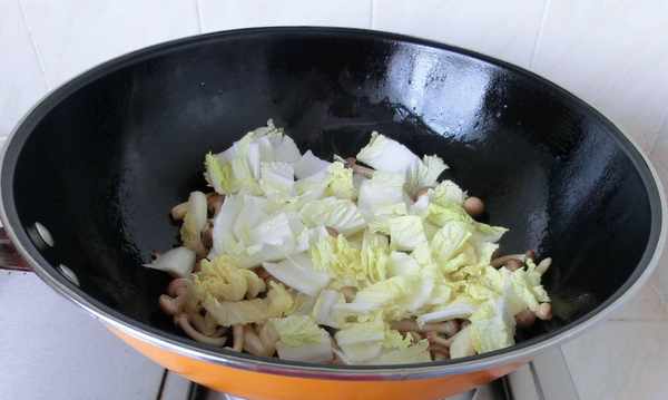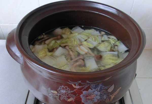 4. 將炒好的蟹味菇、娃娃菜倒入砂鍋中,加適量清水。
