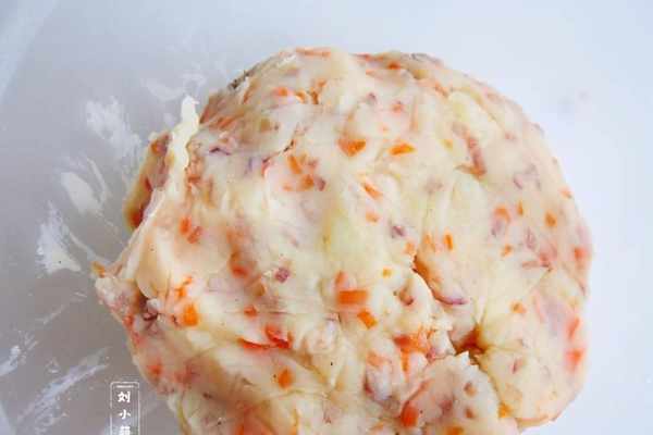 6、把炒好的菜放到土豆泥裡,抓勻。