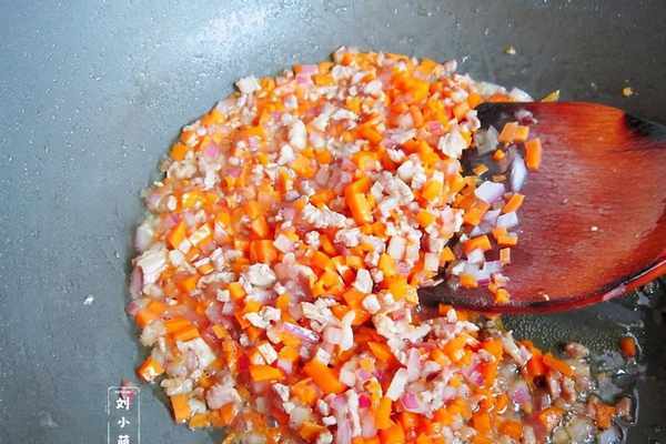 5、鍋中放入適量的油,油燒熱後依次放入肉丁、洋蔥丁和胡蘿卜丁,放入適量的料酒、生抽、鹽、黑胡椒粉炒熟。