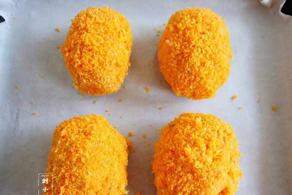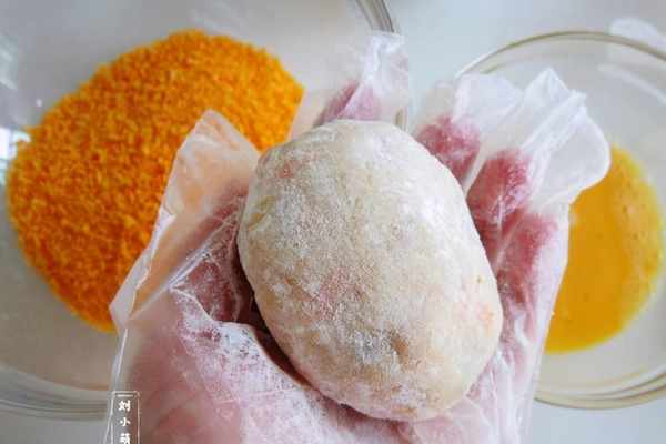 7、取適量的土豆泥整成橢圓形,依次裹面粉、蛋液、面包糠。