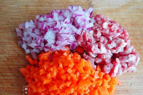 4、把洋蔥、胡蘿卜、豬肉切成丁。
