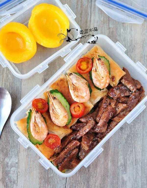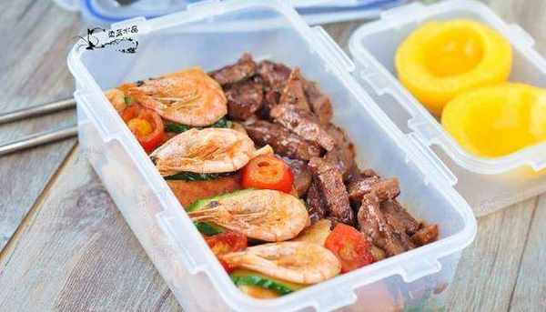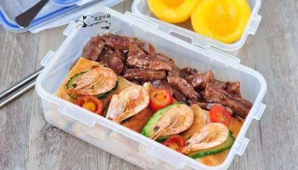 最省事的,其實是半成品,我會經常買一些冷凍的北極蝦、肉類、或者雞米花,平時放在冰箱裡,嘴饞時取出下鍋一煎就行。我還喜歡買牛排套餐,一次10片,還會贈送黃油與醬料包,什麼時候想吃牛排瞭,下鍋煎一煎就搞定!偶爾還會買些春卷、蒸包、速凍水餃之類的,懶得做飯時,隨便煮點就好瞭,特別節約時間。所以冰箱裡隨便拿點東西出來,都可以輕松搞定便當。牛排烹飪完後剪成小塊,更方便食用。不要怕吃不飽,我又煎瞭一袋春卷。再搭配些北極蝦,顯得這份便當更豐盛。傢裡還有黃桃罐頭,也可以順便打包。