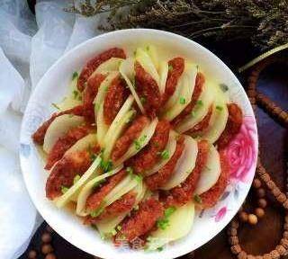 所需食材準備就緒。土豆兩片為一組,中間不要切斷。臘腸改刀,夾入土豆中。依次夾好裝盤。上開水鍋蒸二十五分鐘。隔著玻璃蓋都被饞到啦。出鍋撒蔥末點綴。成品圖。
