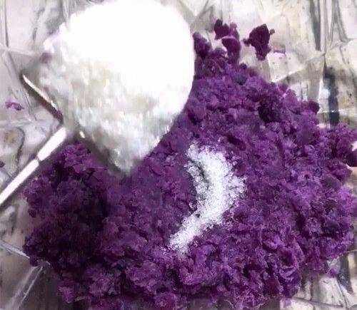 然後將紫薯泥與香芋泥均勻地攪拌在一起,並加入適量的白砂糖。(以自己喜歡的甜度為準)。