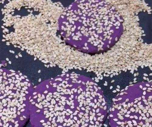 利用紫薯香芋加入白糖之後本身具有的黏度在外面裹上炒制過的白芝麻(也可以用黑芝麻,但是出來的效果沒有白芝麻那麼美觀)