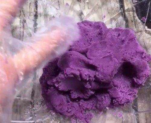 加完糖之後用幹凈的薄膜套在手上(保鮮膜也可以),然後直接用手對紫薯香芋泥進行揉抓,使之變得如同充分揉勻的面團一樣光滑細軟。手的感覺非常靈敏,如果裡面還有沒拌勻的地方通過這一步也可以加以改進。