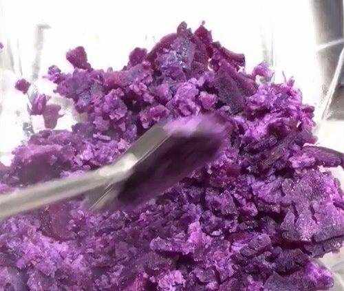 然後用平的鍋鏟或者大勺子將蒸得軟糯的紫薯與香芋壓成泥狀,處理這一步的時候不能貪快,一定要仔細,因為如果殘存有纖維的話會影響口感。