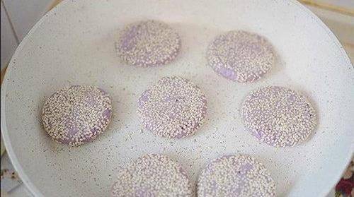 然後就可以在平底鍋底刷上一層薄薄的油將裹著白芝麻的紫薯香芋餅放進去用小火煎瞭,註意不要煎糊瞭,兩面煎得焦黃便可以出鍋瞭。