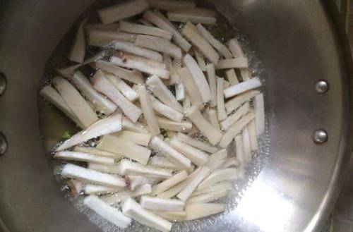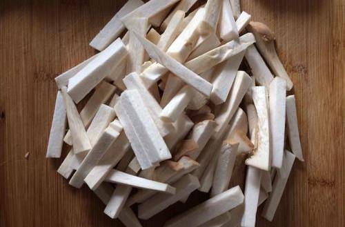 1、杏鮑菇洗凈切成5厘米長,寬7毫米左右長條