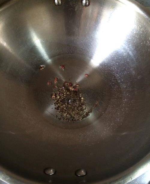 5、另起火,鍋內入油,油溫五成熱下入黑胡椒碎