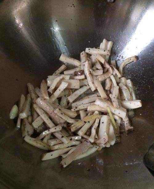 7、下去杏鮑菇大火翻炒,加入料酒,生抽,少許鹽炒1分鐘,再加入點黑胡椒碎