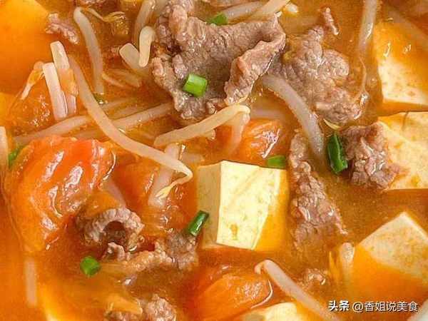 4、再放入醃制好的牛肉片,煮熟後放入綠豆芽和嫩豆腐,繼續煮2分鐘。所有食材煮熟之後,加入食鹽調味,撒上蔥花即可出鍋開吃。