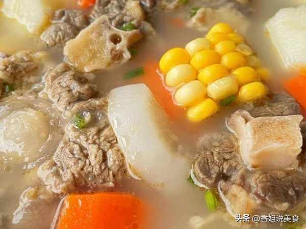 3、將牛尾骨、玉米、薑片放入湯鍋中,加入足量的清水,蓋上蓋子燉煮1.5個小時。接著放入山藥和胡蘿卜,繼續燉煮半個小時。