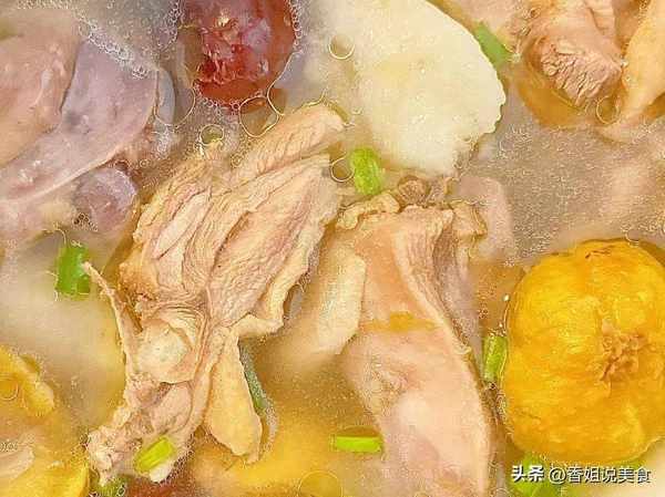 3、將雞肉、板栗、薑片都放入湯鍋中,加入足量的清水,蓋上蓋子燉煮半個小時。再放入山藥,繼續燉煮半個小時。