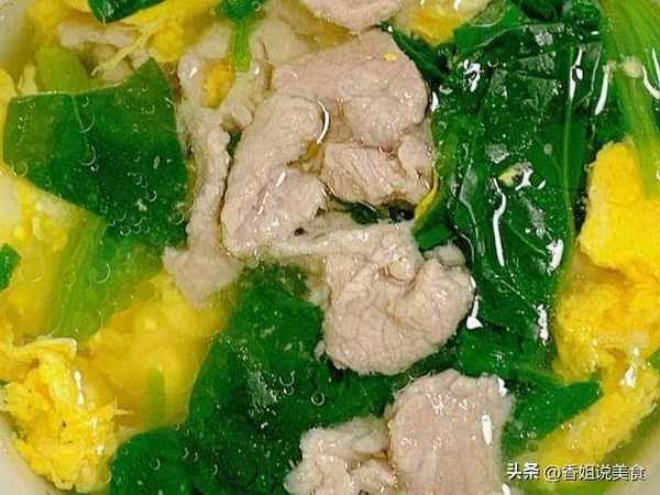 3、起鍋燒水,水燒開後放入醃制好的肉片煮2分鐘左右,煮熟後淋入雞蛋液煮熟,煮至雞蛋液凝固後,再放入菠菜,加入適量的食鹽調味即可出鍋開吃。