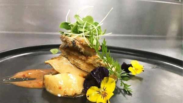 鵝肝100克、黑芝麻50克、牛肉幹1片、卡帕卡拉膠1.2克、拉絲糖100克、燒汁50克