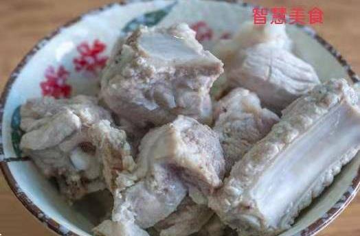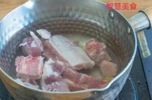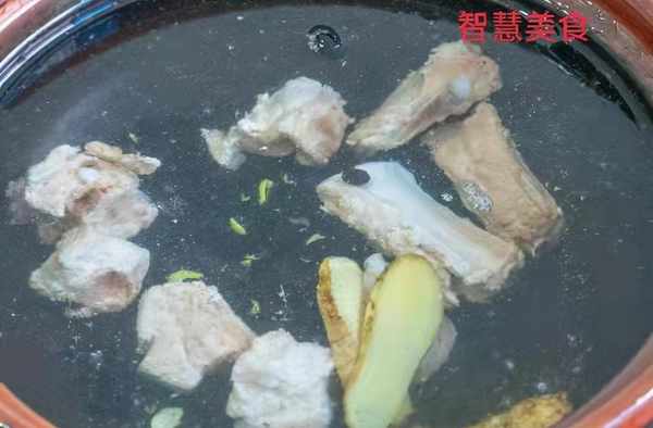 3、然後提前準備200克筒骨,加冷水清洗整潔,隨後涼水下鍋,加生薑片、米酒除腥綽水。
